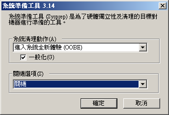 執行後就是選「進入系統全新體驗 (OOBE) 」,別忘了勾選「一般化」,關機的選項我選擇用「關機」因為做好之後我就會將它轉成 Template 了